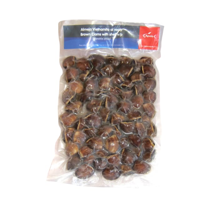 Nuestras Almeja del pacífico congeladas de Mariscos Apolo provienen de Vietnam, y vienen presentadas envasadas al vacío.