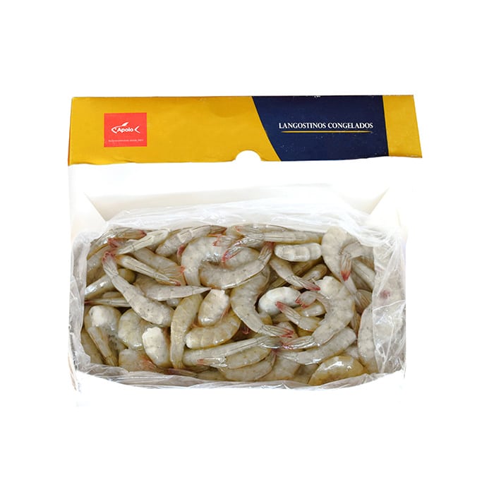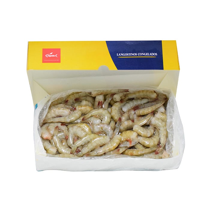 Deliciosas y exquisitas colas de langostino congeladas procedentes de Ecuador presentadas en cajas de 2 kg.