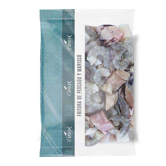 MERLUZA (Merluccius hubbsi) , CALAMAR TROCEADO ( Logilo duvaceli), LANGOSTINO PELADO (Penaeus vannamei), conservante(E-223) , CAELLA (Prionace glauca), ROSADA/PANGA (Genypterus blacodes/Pangasius hypophthalmus).