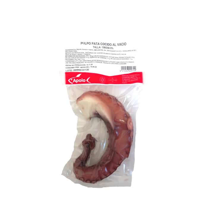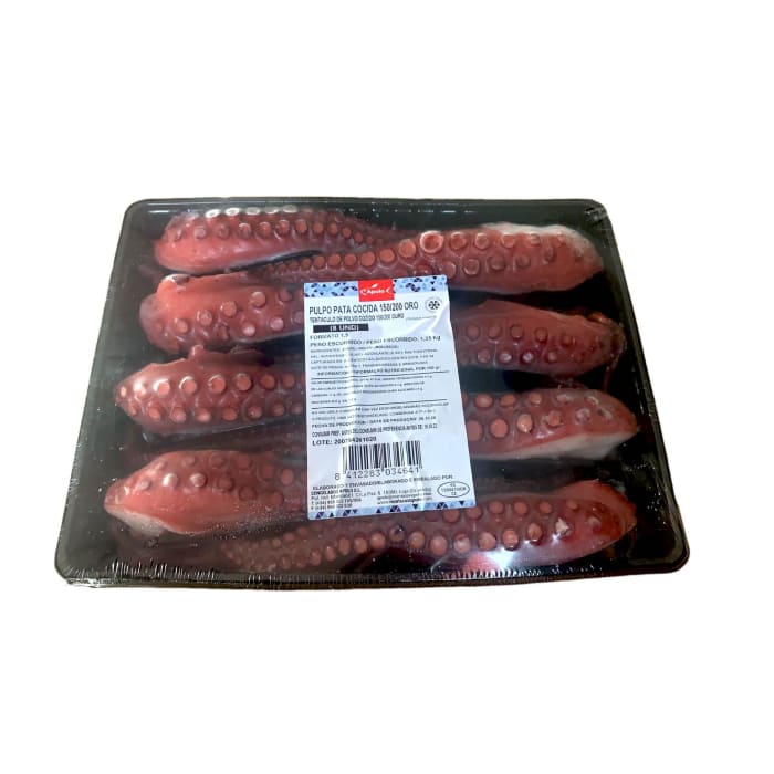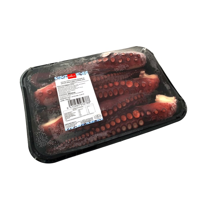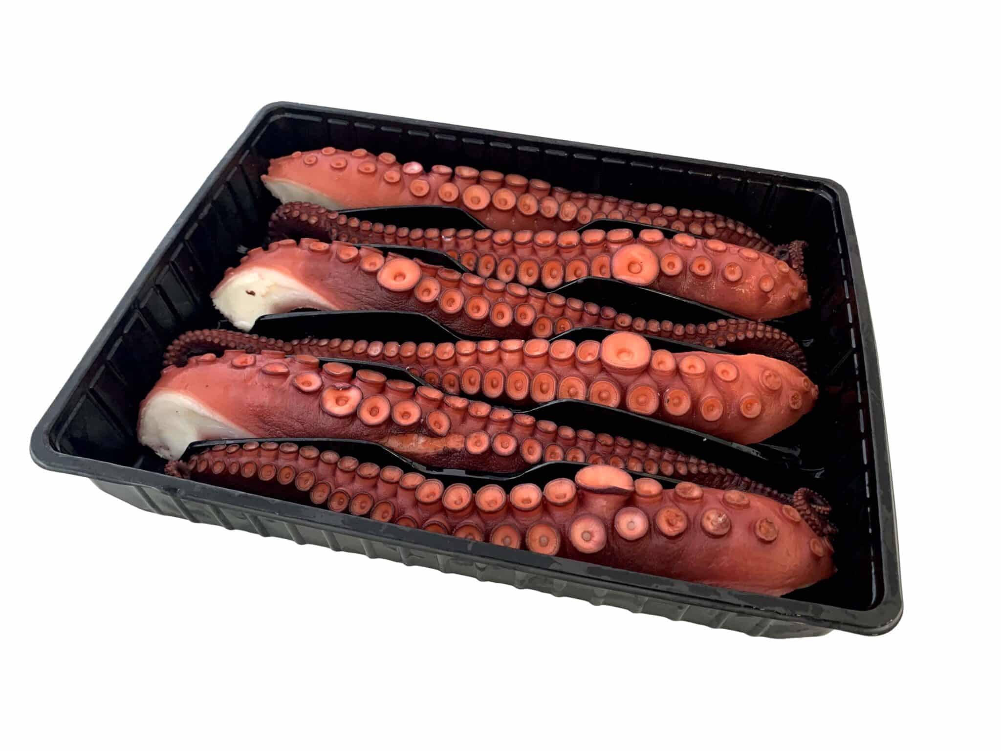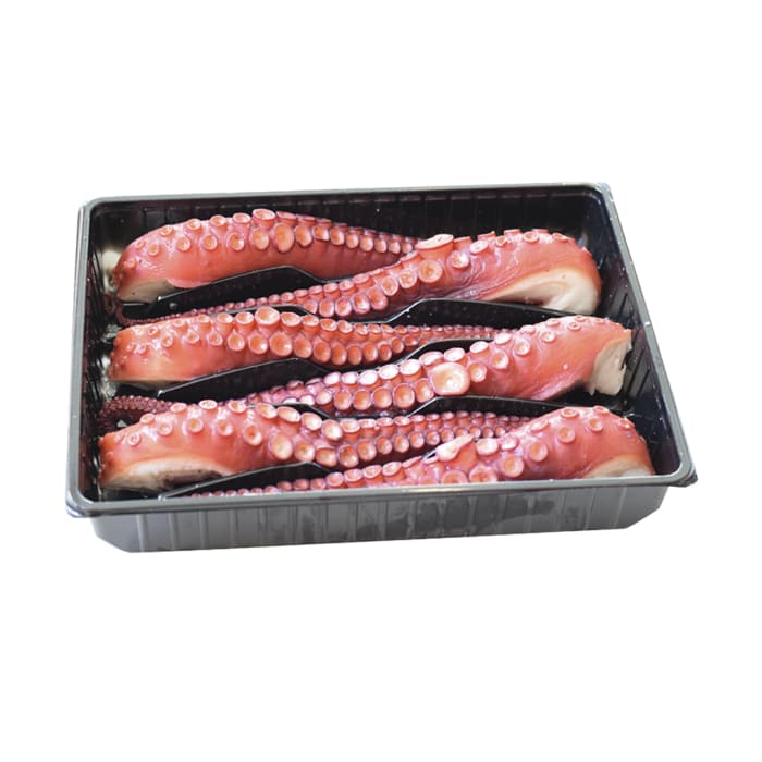 Bandeja de patas de pulpo cocidas en nuestro propio cocedero y congeladas. Pulpo cocido calidad suprema de Mariscos Apolo.